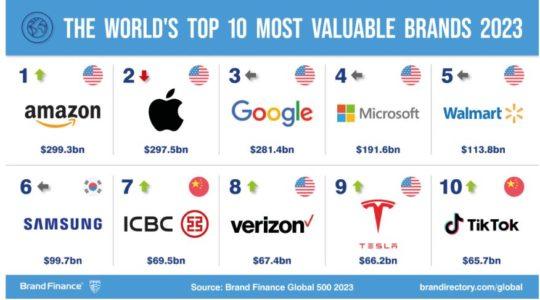 Il marchio Amazon, con un valore di 299 miliardi di dollari in seguito ad una riduzione del 15%, quest’anno è il brand di maggiore valore al mondo grazie al sorpasso a scapito di Apple che, in seguito ad una perdita del 16%, scende ad un valore pari a 297,5 miliardi di dollari.