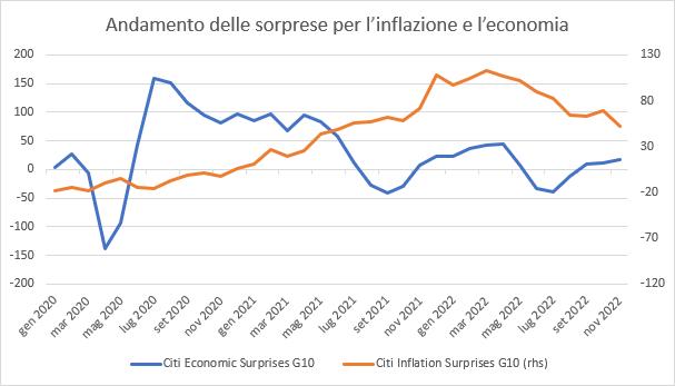 Il 2022 è stato caratterizzato dalla differenza tra le previsioni di inflazione e crescita e i dati i, in particolare negli Stati Uniti. Prendendo come riferimento gli indicatori di sorpresa rispetto all’inflazione di Citi e i dati di crescita delle principali economie (G10), si osserva che nel 2022 il contesto è rimasto in gran parte sfavorevole ai mercati finanziari.