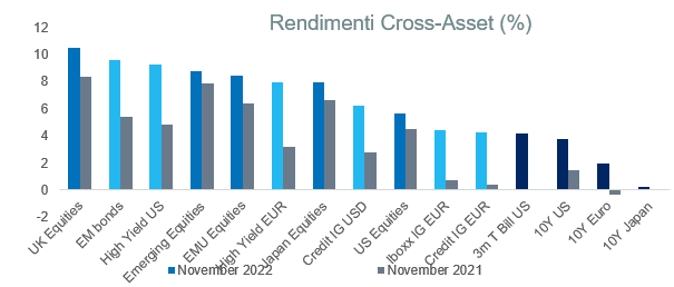 - Tutti i rendimenti attuali sono superiori a quelli di fine 2021, a causa del rialzo dei tassi e del calo delle valutazioni delle azioni.