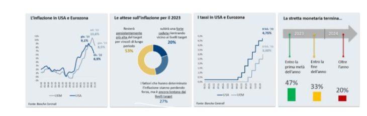 Dall’analisi degli outlook si nota una visione concorde degli Asset Manager, secondo cui il picco dell’inflazione è stato raggiunto nel 2022 e il rientro nel target del 2% non avverrà quest’anno, vedendo gli USA precedere l’Europa. Più della metà (53%) degli operatori ritiene che l’inflazione resterà superiore all’obiettivo nel corso del prossimo triennio, e solo uno su cinque pensa che subirà una forte caduta avvicinandosi al 2%. Anche rispetto all’andamento dei tassi gli Asset Manager associati prevedono una loro risalita nel corso del 2023 (il picco della Fed è in un range tra il 5 e il 5,5%, mentre quello della Bce tra il 3,3 e il 4%). Troviamo invece opinioni divergenti sul rientro della stretta monetaria: poco meno della metà (47%) ritiene che l’azione restrittiva terminerà entro la prima metà dell’anno, il 20% pensa invece che dovremo attendere almeno il prossimo anno. Una volta terminata l’azione restrittiva, Fed e BCE manterrebbero i tassi fermi, valutando la tenuta della crescita. Nello scenario più roseo l’evoluzione del ciclo economico globale potrà assumere la forma di lieve rallentamento, scongiurando una recessione. Una frenata brusca dell’economia è comunque un’eventualità da monitorare e avrebbe, come probabile ammortizzatore, un atteggiamento di politica monetaria nuovamente accomodante.