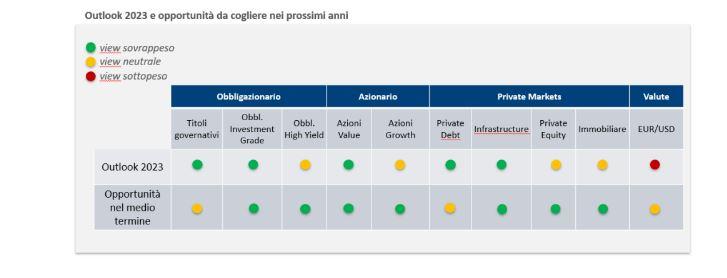 Date le prospettive incerte, il portafoglio di inizio anno degli Asset Manager associati è difensivo, ma pronto ad adattarsi ai cambiamenti che interverranno durante il 2023. In linea generale c’è accordo su un ritorno dell’obbligazionario, con forte interesse verso i titoli governativi (soprattutto USA) e i titoli corporate investment grade, mentre rimane incerto il contesto per gli high yield. La possibilità che i mercati siano volatili, soprattutto nella prima parte dell’anno, porta ad un orientamento prevalente sul comparto azionario votato alla cautela, in attesa che le valutazioni riflettano il rallentamento economico: vengono preferiti i titoli value rispetto a quelli growth. I private market rimangono fonte di opportunità, in particolare per infrastrutture e private debt, ma con un approccio selettivo. Invece, la view sulle materie prime è frammentata e le principali incertezze si legano alla riduzione delle misure anti-Covid in Cina e all’evolversi della crisi energetica europea. Passando alle valute, il dollaro va monitorato e sottopesato, mentre sulle restanti la view è neutrale. Dalla mappatura degli outlook si rileva, infine, che nei prossimi anni le maggiori opportunità si potranno trovare nell’obbligazionario high yield, nell’azionario growth, nel private equity e nel settore immobiliare.