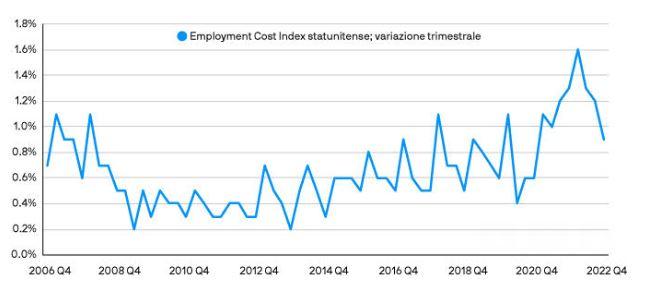 Fonte: Bureau of Labor Statistics (BLS); J.P. Morgan Asset Management. Dati al 31 gennaio 2023. l’Employment Cost Index è un’indagine sulle retribuzioni condotta da BLS presso i datori di lavoro e misura, con frequenza trimestrale, la variazione delle remunerazioni complessive dei lavoratori dipendenti.