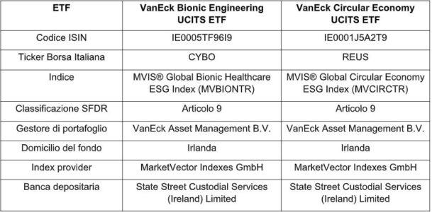 La società di gestione VanEck quota oggi su Borsa Italiana due nuovi ETF: il VanEck Bionic Engineering UCITS ETF, che investe nella bionica, cioè in società che sviluppano soluzioni per impianti medicali o parti del corpo artificiali, e il VanEck Circular Economy UCITS ETF, focalizzato su società che riciclano o riutilizzano le risorse per estendere il ciclo di vita dei prodotti e contribuire alla riduzione dei rifiuti. Entrambi gli ETF adottano un approccio pure-play e investono in società che generano almeno il 50% dei propri ricavi da attività legate rispettivamente all’ingegneria bionica e all’economia circolare. Entrambi gli ETF sono classificati art. 9 della SFDR.