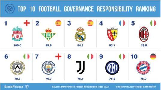 Il Liverpool è il brand percepito come più sostenibile tra i club dei cinque principali campionati europei. Il club ha ottenuto un punteggio complessivo di 86/100 nelle 3 principali metriche di sostenibilità, vale a dire Ambiente, Sociale e Governance (ESG ). Questo ciò che emerge nel report Brand Finance Football Sustainability Perceptions Index 2023, appena reso pubblico sulla base di una survey condotta presso i fan dei principali paesi del mondo nel primo semestre 2022.