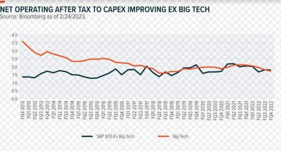Molte aziende non-tech stanno abbracciando le nuove tecnologie per fornire prodotti innovativi e migliorare i loro processi, in tutti i settori. Il risultato è che oggi l’S&P 494 genera un risultato operativo al netto delle imposte (NOPAT) per ogni dollaro di spesa in conto capitale più elevato rispetto alle big tech. Dieci anni fa, le big tech generavano quasi 4 dollari di NOPAT per ogni dollaro di capex, ma nel quarto trimestre del 2022 la cifra era scesa a 1,71 dollari. Nello stesso periodo, l’S&P 494 è passato gradualmente da 1,48 dollari di NOPAT per ogni dollaro di capex a quasi 1,80 dollari. Questo spiega perché le aziende non-big tech hanno aumentato i loro investimenti in conto capitale in modo più aggressivo: si stanno godendo una fetta più grande di una torta in crescita.