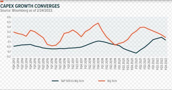 Nell’ultimo decennio, inoltre, l’S&P 494 era rimasto indietro rispetto alle Big Tech nel reinvestire in innovazione: la crescita media annua degli investimenti delle big tech è stata superiore al 30%, ben al di sopra della crescita media dell’S&P 494, vicina al 2%. Ma anche questa tendenza si sta invertendo: il divario ha iniziato a ridursi durante la pandemia e ha continuato a diminuire dopo la riapertura dell’economia. Nel quarto trimestre del 2022, la crescita del capex dell’S&P 494 era del 13% su base annua, rispetto al 18% delle big tech.