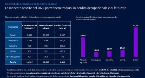 Entrando più nel dettaglio sulla stima dell’impatto che il calo di start-up del 2022 potrebbe avere sui diversi settori dell’economia, le più colpite rischiano di essere le utility (-117 milioni di euro di fatturato e -60,1% di addetti, a causa di 460 nuove nascite in meno), seguite dalle aziende agricole (-74,9 milioni di euro, -39,8% di addetti, -407 start-up), dai servizi (-1.967 milioni di euro, -14.6% di addetti che però in cifra assoluta si traducono in ben 19.000 persone, – 7.945 start-up), dall’industria (-160 milioni di euro, -12,8% di addetti, -691 start-up) e infine dalle costruzioni (-193,6 milioni di euro, -10% di addetti, -1.135 start-up), che avevano visto un vero e proprio boom nel 2021 grazie ai vari bonus edilizi. In totale, 27.080 lavoratori stimati in meno e una perdita di fatturato di oltre 2,5 miliardi di euro.