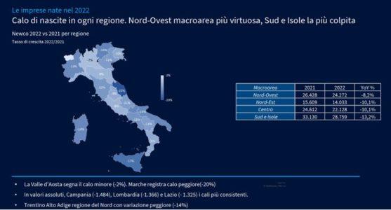 In cifra assoluta, nel Mezzogiorno le nuove imprese sono passate da 33.130 nel 2021 a 28.759 nel 2022 (-13,2%), al Centro da 24.612 a 22.128 (-10,1%; stessa percentuale del Nord Est, da 15.609 a 14.033), nel Nord Ovest da 26.428 a 24.272 (-8,2%). A livello regionale, la Valle d’Aosta segna il calo minore di nascite di imprese (-2%), mentre le Marche quello peggiore (-20%), a causa della crisi che ha investito i distretti del manifatturiero a partire dalla moda e dalle calzature. In valori assoluti, invece, sono la Campania (-1.484 aziende), la Lombardia (-1.366) e il Lazio (-1.325) ad avere subìto i cali più consistenti. Al Nord, la regione più impattata è il Trentino-Alto Adige (-14%).