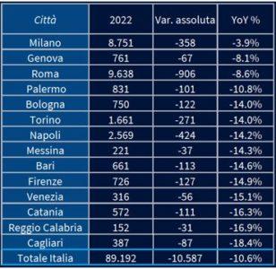 Analizzando le grandi città, si vede invece come Milano sia quella più dinamica, con un calo di “sole” 358 nuove imprese rispetto al 2021 (-3,9%), seguita da Genova (67, -8,1%) e Roma (906, -8,6%), mentre le successive hanno comunque un saldo negativo a due cifre: Palermo (101, -10,8%), Bologna (122, -14%) Torino (271, -14%), Napoli (424, -14,2%), Messina (37, -14,3%), Bari (113, -14,6%), Firenze (127, -14,9%), Venezia (56, -15,1%), Catania (111, -16,3%), Reggio Calabria (31, -16,9%), Cagliari (87, -18,4%).