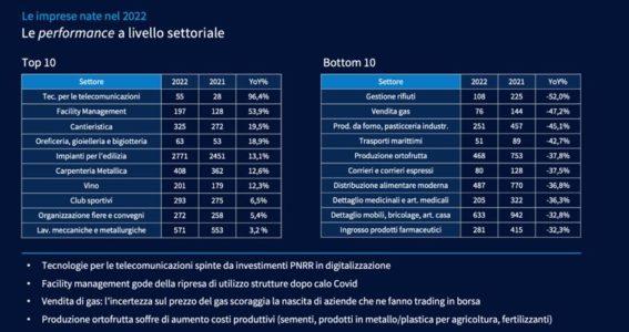 Venendo ai singoli settori, in cima alla top 10 dei più performanti troviamo le tecnologie per telecomunicazioni, spinte dagli investimenti del PNRR in digitalizzazione, che salgono dalle 21 startup del 2021 alle 55 del 2022 (+96,4%), il facility management, che ha goduto della ripresa di utilizzo delle strutture dopo il calo dovuto al Covid (da 128 a 197 startup, +53,9%), la cantieristica (da 272 a 325, +19,5%) e gli impianti per l’edilizia (da 2451 a 2771, +13,1%), trainati dalla domanda generata dal PNRR. Al contrario, tra i peggiori 10 ci sono la gestione dei rifiuti (da 225 a 108 startup, -52%), la vendita di gas (da 144 a 76, -47,2%), su cui ha pesato l’incertezza sul prezzo, i prodotti da forno e la pasticceria industriale (da 457 a 251, -45,1%), i trasporti marittimi (da 89 a 51, -42,7%) e la produzione di ortofrutta (da 753 a 468, -37,8%), che ha sofferto l’aumento del costo delle sementi, dei prodotti in metallo/plastica per l’agricoltura e dei fertilizzanti.