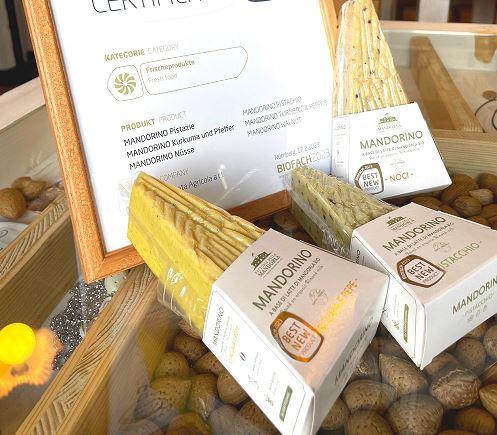 Primo posto sul podio nella categoria Fresh food dei Best New Product Awards di Biofach 2023 per Fattoria della Mandorla di Toritto (Bari), l’azienda italiana che ha reso nota la varietà Filippo Cea, che produce nei suoi 75 ettari di terreno siti nell’Alta Murgia, trasformandola in golose alternative vegetali al formaggio. Con i suoi Mandorini, gli stagionati che ricordano forma, consistenza e sapore del classico pecorino, declinati nei tre gusti curcuma e pepe, pistacchio e noce Fattoria della Mandorla ha saputo conquistare i visitatori del Biofach. Le referenze premiate sono realizzate con ingredienti pregiati e ricercati, provenienti da filiera corta ed economia circolare tutta italiana, a dimostrazione che il Made in Italy e l’attenzione all’ambiente, se uniti, creano un valore aggiunto.