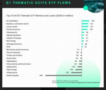 Nel primo trimestre 2023, i flussi sugli ETF tematici UCITS hanno registrato una chiusura negativa, con un risultato netto pari a meno 700 milioni di dollari. Tuttavia, se si esclude il tema della Gender Equality (-893 milioni di dollari), il dato risulta invece positivo, con un +193 milioni. Dalla nostra analisi, l’intero deflusso del tema Gender Equality è dovuto all’operazione compiuta da un singolo gestore su un proprio ETF, pertanto abbiamo escluso questo dato “anomalo” ai fini della nostra analisi.