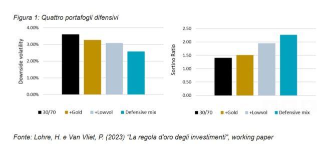 Tuttavia, le nostre simulazioni mostrano che la volatilità di ribasso può essere ulteriormente ridotta adottando uno stile di investimento a bassa volatilità nell’azionario e lasciando che questa allocazione azionaria difensiva sostituisca parte dell’allocazione obbligazionaria. Il portafoglio con la minore volatilità di ribasso su un orizzonte di un anno è composto da 45% di obbligazioni, 45% di azioni a bassa volatilità e 10% di oro.