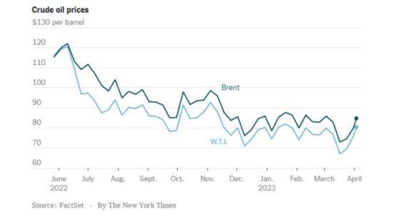 L’Opec+ ha annunciato che ridurrà la produzione del petrolio di 1 milione di barili al giorno a partire da maggio, dopo averla già diminuita di 2 milioni a ottobre. È importante ricordare che, anche in precedenza, l’organizzazione spesso non raggiungeva i propri obiettivi di produzione. La decisione è stata accolta con sorpresa a livello globale, dato che vari paesi membri avevano annunciato pubblicamente che non avrebbero ridotto l’offerta, almeno fino al termine del 2023. Di conseguenza, sia i prezzi del petrolio attuali (grafico sotto rappresentato) che le previsioni di essi per dicembre, sono aumentati. Le stime per i prezzi alla fine dell’anno sono state alzate persino a $100 al barile.