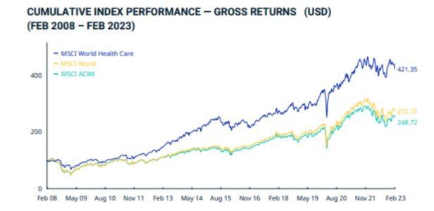 Dal 1990 al 2022, il settore sanitario ha avuto la seconda performance annuale migliore tra i settori principali del mercato. Le motivazioni per cui l’industria medica è attraente per gli investitori sono molteplici. Innanzitutto, offre una grande diversità settoriale, con aziende farmaceutiche, di biotecnologia, attrezzatura medica, medtech, servizi sanitari e altro ancora. Nella sanità troviamo anche molta diversità geografica e a livello di capitalizzazione, con prospettive interessanti sia nei mercati più sviluppati che nei mercati emergenti. Inoltre, gli over 65 aumenteranno del 156% dal 2015 al 2050. Quest’invecchiamento della popolazione mondiale offre una possibilità di crescita significativa del settore. La sanità è caratterizzata da interesse e investimento pubblico, dato che rappresenta un servizio necessario per mantenere alta la qualità di vita in un paese. Infine, la domanda per i prodotti e servizi medici è inelastica, ovvero poco dipendente dalle variazioni di mercato.