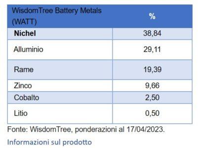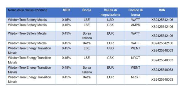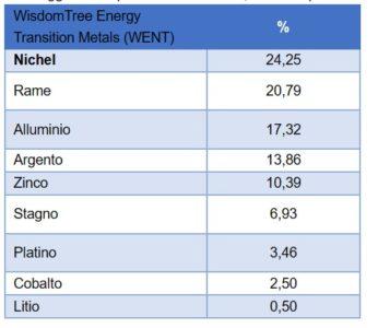Il WisdomTree Energy Transition Metals ETC (exchange-traded commodity) consente agli investitori di accedere ai metalli maggiormente coinvolti nel megatrend della transizione energetica, tra cui veicoli elettrici, trasmissione, ricarica, immagazzinamento di energia, produzione di energia solare, eolica e a idrogeno. L’indice comprendeva rame, nichel, alluminio, argento, zinco, stagno e platino, e ora anche litio e cobalto.