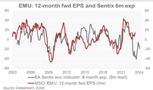 Negli Stati Uniti i risultati relativi al primo trimestre sono stati ben al di sopra delle aspettative. Dopo il forte calo nelle stime degli analisti prima dell’inizio della reporting season (-6,5% su base annua da gennaio 2023 per gli utili di Q1), tali previsioni erano senz’altro più facili da battere. Inoltre le stime del PIL mondiale sono migliorate nel corso del trimestre e le sorprese macro globali hanno raggiunto un picco alla fine di marzo. Per la media dei titoli USA, la crescita degli utili (EPS, utile per azione) nel primo trimestre è stata così del 4,6% su base annua, rispetto all’8,3% del quarto trimestre del 2022. Le sorprese rispetto alle attese degli analisti sono superiori se confrontate a quelle del quarto trimestre: +5% contro +3%. I dati relativi all’indice europeo sono ancora migliori: la crescita su base annua dell’EPS è dell’11%, e le sorprese verso le attese di mercato sono arrivate al +8%, entrambi i numeri sono migliori rispetto al 4Q 2022.