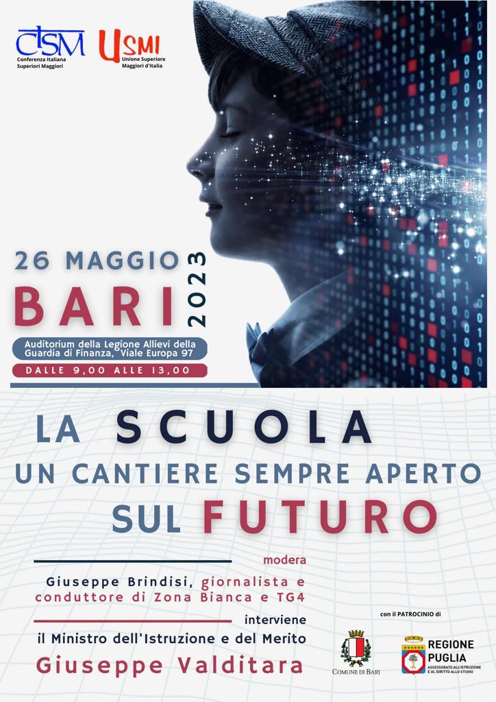 Si terrà nella città di Bari il Convegno “La scuola, un cantiere sempre aperto sul futuro” promosso dall’Ufficio Scuola CISM e USMI Nazionale e dedicato al mondo dell’istruzione nel Mezzogiorno d’Italia.