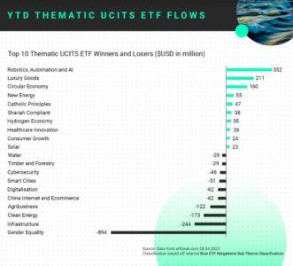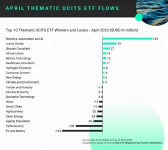 Per quanto riguarda i deflussi, ad aprile il tema Veicoli elettrici e Batterie risulta il peggiore con -163 milioni di dollari. Un dato forse sorprendente, se si considera che l’amministrazione Biden ha annunciato ulteriori iniziative per sostenere la transizione USA verso i veicoli elettrici, con la EV Acceleration Challenge. È possibile che gli investitori abbiano preso profitto su questo tema dopo che i prezzi di molti titoli hanno raggiunto i massimi a inizio febbraio, a seguito del rally scatenato dall’approvazione dell’Inflation Reduction Act.