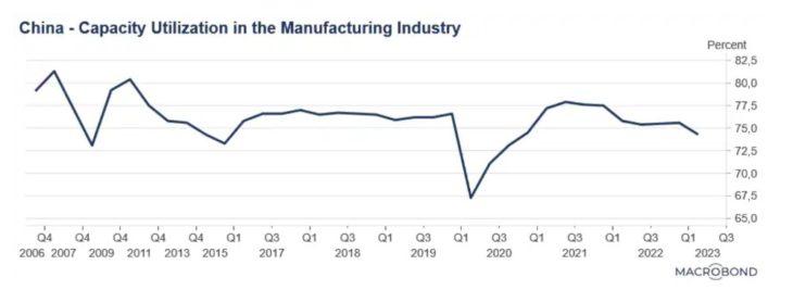 A breve termine, i governi locali possono continuare a sostenere la competitività degli esportatori ma di fatto prima o poi raggiungeranno il limite, in quanto sono comunque finanziariamente schiacciati. In definitiva, la crescita delle esportazioni, per essere considerata solida e vero traino per l’economia globale, deve provenire dal settore delle famiglie. Questo è, invece, attualmente il punto più debole dell’economia cinese. La maggior parte degli analisti, a seguito delle riaperture in Cina, si aspetta proprio un’impennata della domanda interna per guidare la crescita complessiva del PIL in modo sano. Ma finora è stato molto difficile trovare prove di forza relative all’aumento dei consumi. Il dato sull’inflazione di marzo (0,7% anno su anno) e il basso livello di utilizzo della capacità nel settore manifatturiero (74,3% nel primo trimestre, come mostrato dal grafico sottostante) non aiutano.