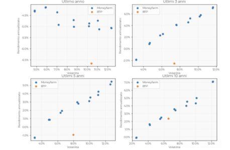 Se si vuole fare un confronto tra il BTP e una gestione patrimoniale multi-asset come quella di Moneyfarm è importante considerare diversi aspetti: storicamente, soluzioni multi-asset hanno beneficiato di una maggiore diversificazione che ha permesso un miglior profilo rischio-rendimento. Il grafico sotto riporta l’andamento dei portafogli Moneyfarm su diversi orizzonti temporali a confronto con la performance di un indice generico che investe nell’insieme di titoli del tesoro italiani disponibili sul mercato (si badi che le performance dei portafogli Moneyfarm sono al netto del costo degli strumenti sottostanti ma al lordo di oneri fiscali e costi della piattaforma; l’indice sui titoli del tesoro italiani è al lordo di ogni tipo di costo; i rendimenti futuri del BTP dipendono dal tasso di rendimento di partenza).