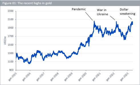 Il recente rally dell’oro è stato innescato nel novembre dello scorso anno, quando i mercati hanno iniziato a prevedere un rallentamento dell’inflazione nel 2023 e la Federal Reserve (Fed) ha attenuato un approccio falco. Di conseguenza, nonostante i successivi aumenti dei tassi d’interesse, i rendimenti dei Treasury decennali sono scesi e il dollaro si è deprezzato, entrambi fattori che favoriscono l’oro. Un ulteriore sostegno è arrivato dai problemi del settore bancario, che hanno ricordato agli investitori di mantenere le loro coperture, viste le fragilità sistemiche che possono essere esposte quando la politica monetaria viene inasprita in modo aggressivo.