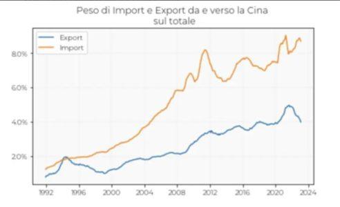 Se poi andiamo a confrontare le variazioni annuali di import ed export tra Italia e Cina con quelle degli altri paesi dell’area Euro, si può osservare come negli ultimi 30 anni questo differenziale sia stato negativo sia sul fronte delle esportazioni che delle importazioni. In altre parole, il nostro commercio con la Cina è cresciuto molto più in fretta rispetto a quello dei partner europei, per andare poi a stabilizzarsi in questi ultimi ultimi anni in cui la velocità di crescita degli investimenti risulta essere abbastanza equivalente o inferiore (nell’ultimo anno). Attenzione però a non trarre conclusioni affrettate. È sicuramente vero che la Cina ricopre un ruolo importante nella bilancia commerciale italiana ma, stando ai dati Eurostat, il partner commerciale più importante per il nostro Paese, così come per la maggior parte degli stati europei, rimane la Germania. Se si allarga infine lo sguardo all’Unione europea, è altrettanto importante sottolineare che nel 2021 la Cina è stato il partner commerciale più importante per i 27 stati membri, scambiando valori per 696 miliardi di euro (import ed export): più importante degli Stati Uniti dati alla mano.