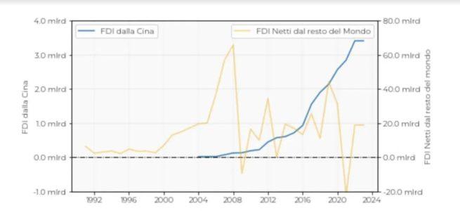 Nel 2019 il governo Conte ha siglato il primo Memorandum della Via della Seta con la Cina. L’Italia, come detto, è stato l’unico paese dell’Ue e del G7 ad entrare a far parte del progetto di sviluppo cinese: abbiamo avuto dei vantaggi da questo Memorandum? La risposta la si trova nei dati. La Cina negli ultimi 15 anni ha investito molto in Italia. Osservando il monitoraggio costante degli FDI, ossia gli investimenti diretti esteri, si può infatti notare come il Dragone si sia mosso in controtendenza, rispetto al resto del mondo, soprattutto dal 2019 in poi. Dal 2004 il flusso di FDI cinesi verso il nostro Paese è cresciuto in modo più costante e più consistente rispetto al resto del mondo. Come si può notare dal grafico sotto, il flusso netto degli investimenti verso l’Italia, a livello globale, è stato molto basso (se non addirittura negativo in alcuni momenti), mentre il Dragone ha rappresentato una costante per il nostro Paese. Trend che viene suggellato dalla firma del Memorandum della Via della Seta tra Italia e Cina nel 2019 e che ha continuato a dare i suoi frutti fino a oggi. Dai dati si evince infatti che per quest’anno l’Italia ha ricevuto investimenti diretti per un valore di 70 miliardi di euro dalla Cina e di 20 miliardi di euro, in media, dagli altri paesi europei: una differenza di non poco conto.