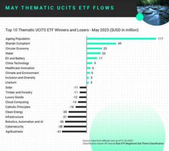 Il tema Agribusiness, esploso con una raccolta di 780 milioni di dollari nel 2022, quest’anno ha registrato deflussi per 163 milioni di dollari. Questo suggerisce che gli afflussi dello scorso anno fossero probabilmente posizionamenti tattici, legati all’inflazione sui prodotti alimentari causata della guerra. Anche a maggio questo tema ha visto capitali in uscita per circa 41 milioni.