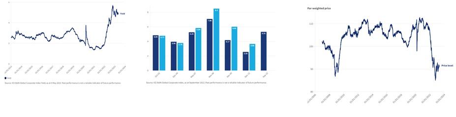 Prezzi al livello più interessante degli ultimi anni: il prezzo delle obbligazioni investment grade è sceso a circa 85 (prezzo ponderato alla pari dell’indice Global Corporate) a metà del 2022, avvicinandosi a livelli visti solo durante la crisi finanziaria globale del 2008. Il prezzo ponderato pesa il prezzo di ciascuna obbligazione in base alla sua dimensione relativa nell’indice. Indica se l’indice è generalmente venduto a prezzi superiori o inferiori al valore nominale, il che può influenzare la sensibilità ai tassi d’interesse.