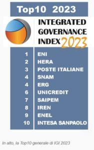Definita la Top10 dell’Integrated Governance Index 2023. A guidare la graduatoria sono Eni, che guadagna una posizione rispetto allo scorso anno, seguita da Hera (prima nel 2022) e Poste Italiane (quinta a pari merito la scorsa edizione), con Snam ed Erg quarte a pari merito. Ai vertici delle non quotate ci sono Astm, BNL BNP Paribas e Crédit Agricole Italia, davanti a Cdp e Alperia. Mentre SIT Spa si afferma come prima delle società quotate extra le prime 100, davanti a Fiera Milano, Gefran, Newlat Food e Fnm.