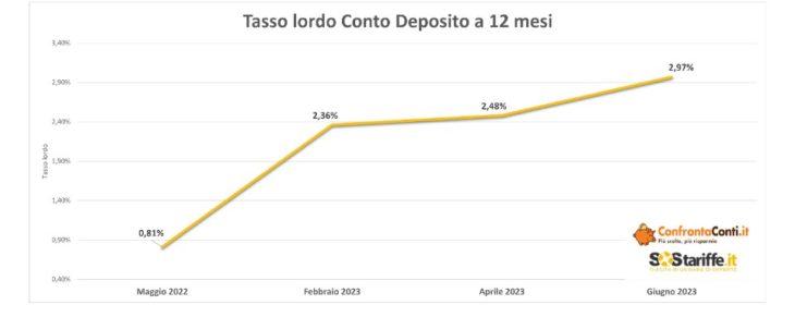 Analizzando le proposte per il Conto Deposito a giugno 2023, la convenienza dell’investimento appare sempre più evidente. Su base annua, considerando gli investimenti a 12 mesi, si registra una crescita di 2,16 punti per quanto riguarda il tasso lordo applicato all’investimento. Il settore diventa sempre più conveniente: rispetto ad inizio 2023, infatti, oggi il tasso medio fa segnare un miglioramento di +0,61 punti.