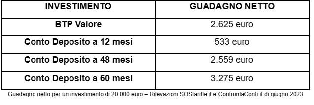 Limitando l’analisi alle 3 migliori proposte di giugno 2023, però, il guadagno netto cresce in modo significativo. In questo caso, infatti, investire nel Conto Deposito consente di ottenere un guadagno netto, nel caso preso in esame, di 2.559 euro, avendo considerato sia la ritenuta fiscale che, quando dovuta, l’imposta di bollo. Il guadagno netto è, quindi, molto vicino a quello garantito dal BTP Valore.