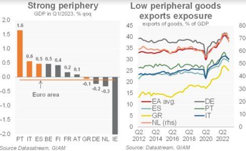 L’area dell’euro è tecnicamente in recessione, dato che il PIL si è contratto negli ultimi due trimestri. In tale quadro, i paesi periferici hanno registrato tassi di crescita molto superiori alla media (con l’eccezione della Grecia). Uno dei motivi principali è la minore esposizione alla debolezza del ciclo globale. La periferia dell’area euro è meno orientata all’esportazione verso la Cina rispetto, ad esempio, alla Germania o ai Paesi Bassi. Mentre le economie più orientate all’esportazione di beni continueranno ad affrontare forti venti contrari, la periferia beneficerà della stagione turistica. Inoltre, l’erogazione del Recovery Fund stimolerà la domanda. Da ultimo, l’inflazione è attualmente (con l’eccezione dell’Italia) al di sotto della media della regione.