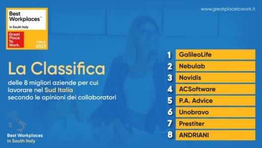 Ma quali sono le 8 aziende che compongono il ranking dei Best Workplaces in South Italy? Al primo posto troviamo GalileoLife, azienda pugliese del settore farmaceutico con sede a Maglie in provincia di Lecce, davanti all’abruzzese Nebulab, attiva nel settore IT mentre occupa il terzo gradino del podio Novidis, un’altra organizzazione IT con sede a Colonnella, in provincia di Teramo. Completano la classifica la calabrese ACSoftware Srl (Information Technology), le campane P.A. Advice SpA (servizi professionali) e Unobravo (farmaceutico), la molisana Prestiter (servizi finanziari e assicurativi) e la pugliese Andriani S.p.A. (manifattura e produzione).
