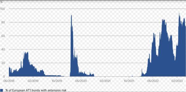 Tuttavia, l’episodio del CS non ha lasciato indenne il mercato delle obbligazioni AT1, come mostra il nostro grafico della settimana. Il grafico può essere letto come un indicatore di stress, perché mostra come molte delle obbligazioni AT1 in circolazione siano prezzate come se avessero durata perpetua, cioè come se gli emittenti non esercitassero mai il loro diritto di richiamarle. Ci possono essere ragioni per cui una banca non richiama le proprie obbligazioni AT1 in circolazione, ma è una pratica di mercato più che comune per le banche richiamare le proprie obbligazioni ed emetterne di nuove.