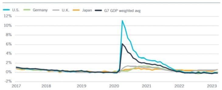 Sebbene quest’anno l’inflazione abbia mostrato un rallentamento, le economie non hanno ancora scontato il prezzo in termini di perdite di posti di lavoro o di una contrazione economica più ampia. Infatti, nel primo trimestre la crescita del PIL è accelerata negli Stati Uniti, in Europa e in Cina. In tutte le economie dei mercati sviluppati, il tasso di disoccupazione rimane ampiamente inferiore a quello pre-Covid (Figura 2). Con il caro-affitti che inizia a dare segni di raffreddamento e il prezzo del petrolio sceso di quasi il 30% rispetto a un anno fa, possiamo notare i primi ingredienti per un effetto deflattivo moderato. Detto questo, i miglioramenti non saranno uniformi e ci aspettiamo ancora che l’inflazione core degli Stati Uniti si avvicini al 4% a fine anno, il doppio dell’obiettivo del 2% fissato dalla Fed.