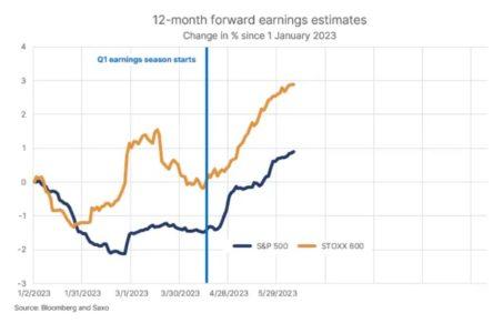 L’indice VIX di per sé non permette di prevedere il rendimento azionario futuro, ma la curva a termine dei futures VIX ha dimostrato di migliorare la prevedibilità dei rendimenti. Osservando lo spread tra il Future sul VIX e l’indice VIX notiamo come sia attualmente a 3,4 punti, esattamente la media di lungo termine. La curva forward del VIX è tipicamente in contango (slopping verso l’alto). Questo livello di contango è tipicamente associato a rendimenti azionari positivi, quindi il mercato delle opzioni azionarie sta inviando un altro possibile segnale secondo cui le azioni potrebbero estendere il loro slancio. Anche le stime degli utili riflettono la stessa prospettiva, grazie anche alla positiva stagione delle trimestrali del primo quarto del 2023: le prospettive delle aziende, infatti, sono state molto più ottimistiche rispetto ai timori iniziali.
