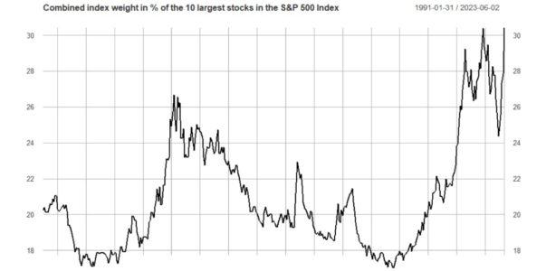 L’S&P 500 non è mai stato così concentrato, con i 10 titoli più importanti che nelle scorse sedute sono arrivati a rappresentare un peso dell’indice pari al 30,4% complessivo. Questo ovviamente non è un buon segno perché rende il mercato azionario statunitense più fragile e sensibile a piccole variazioni del sentiment di alcuni titoli. Di fatto, all’interno dello stesso indice non vi è diversificazione. Un’elevata concentrazione degli indici tende, inoltre, ad essere correlata a grandi rotture dei mercati finanziari durante la transizione verso un nuovo regime.