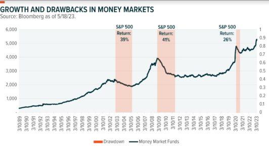 Innanzitutto, nel maggio 2023 i flussi verso i mercati monetari, a causa del sentiment ribassista e dell’aumento dei tassi a breve termine, hanno raggiunto il massimo storico. Attualmente, la liquidità nei mercati monetari ammonta a oltre 5.300 miliardi di dollari, con un aumento del 13% su base annua. In genere, i fondi nei mercati monetari aumentano nel tempo, ma ogni tanto si verificano delle flessioni. I modelli storici suggeriscono che le azioni in genere ne beneficiano: ogni volta che la liquidità nei mercati monetari si è ridotta, l’S&P 500 è salito in maniera importante.