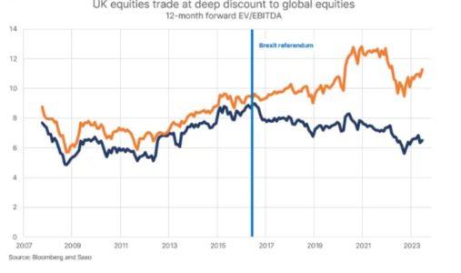 Il referendum sulla Brexit a favore dell’uscita del Regno Unito dall’UE non è stato inizialmente uno shock per il mercato azionario britannico, ma quando gli investitori si sono resi conto di cosa avrebbe significato per l’attività economica a lungo termine, l’inflazione e la competitività, il divario di valutazione rispetto alle azioni globali si è ampliato in modo significativo ed è peggiorato dopo la Brexit. Oggi, le azioni del Regno Unito sono valutate con uno sconto del 42% rispetto alle azioni globali.