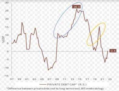La vera domanda da porsi è la seguente: le dinamiche economiche cinesi odierne stanno ricalcando quanto visto in Giappone dopo lo scoppio della bolla degli anni Ottanta? Abbiamo infatti visto mettersi in atto delle dinamiche preoccupanti che, per molti, possono ricordare le decadi perse in Giappone a partire dagli anni ’90. In particolare, meritano attenzione alcune dinamiche: la prima va sotto il nome di balancesheet recession, una recessione causata dall’eccesso di debito del settore privato e che può sfociare in un contesto recessivo caratterizzato dalla diminuzione dei prezzi delle attività finanziarie ed immobiliari, dalla contrazione di consumi ed investimenti e, infine, una deflazione. Inoltre, l’eccesso di debito può provocare fallimenti degli attori economici, portando con sé sofferenze bancarie e contrazione del credito, anche questa potentemente deflazionistica. Infine, vi è la possibilità che si verifichi una trappola della liquidità: l’eccesso di debito genera vendite forzate delle attività finanziarie e una preferenza per la liquidità. È innegabile, dunque, che la Cina risenta oggi delle distorsioni legate al monte di debito accumulato: l’eccesso di debito privato rispetto al trend storico ha toccato un picco attorno al 2018-2019 (l’ultima volta che successe era nel periodo 2012-2013).