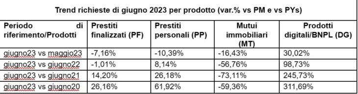 A giugno, sono calate le richieste di mutui e prestiti rispetto a maggio 2023, mentre l’utilizzo del “Buy Now, Pay Later” continua ad essere sempre più marcato, con +30% di richieste rispetto allo scorso mese e oltre il +300% rispetto a giugno 2020. L’ultimo Rapporto sul Credito