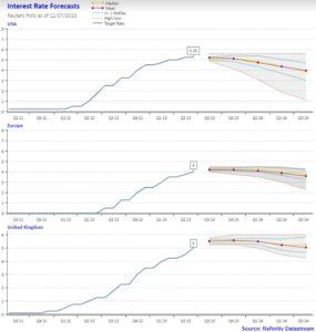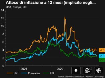 Gli analisti al momento prevedono una graduale normalizzazione dei livelli di inflazione, fino a sfiorare la soglia del 2% entro la fine dell’anno, sia negli Stati Uniti, sia in Europa, anche se qui i ritmi di discesa sembrano essere più lenti e i mercati prezzano almeno altri due aumenti dei tassi nell’Eurozona, ma ne potrebbero servire di più.