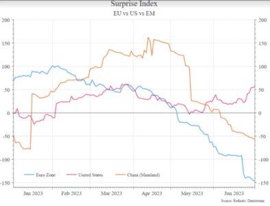 Con i rialzi dei tassi a cui abbiamo assistito negli scorsi mesi, la possibilità di una recessione era data quasi per scontata nel 2023. In realtà, la performance economica ha continuato a sorprendere in positivo, come si può notare dagli indici di sorpresa per Europa, USA e Cina, che misurano la performance dell’economia rispetto alle aspettative (sotto). Cina ed Europa hanno deluso, mentre gli Stati Uniti si sono ripresi dopo un inizio anno sottotono.