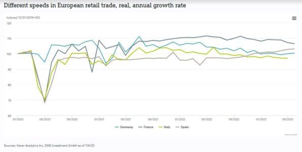Il settore della vendita al dettaglio in Europa è stato scosso dal Covid, ma abbiamo buone ragioni per credere che si stia stabilizzando, aiutando le economie europee nel secondo semestre del 2023, insieme a un settore dei servizi in crescita.