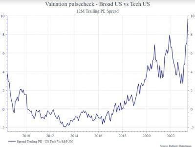 Da inizio anno a fine maggio, il Wilshire 5000, ovvero l’indice statunitense più comprensivo, ha fatto registrare un ritorno dell’8,8%, di cui l’’8,4% può essere attribuito alle 10 azioni più grandi per market cap. Il sintomo più visibile è l’aumento del “costo” delle azioni tech americane, che ora hanno un rapporto prezzo/utili molto più alto rispetto all’S&P 500 (quasi in linea con i picchi del 2021, quando i tassi erano ai minimi e le tech stocks dominavano la narrativa dei mercati nel mondo post-pandemia). Nel breve termine, dunque, esiste sicuramente il rischio di una normalizzazione, ma sarebbe un grave errore derubricare questo trend come una tendenza passeggera.