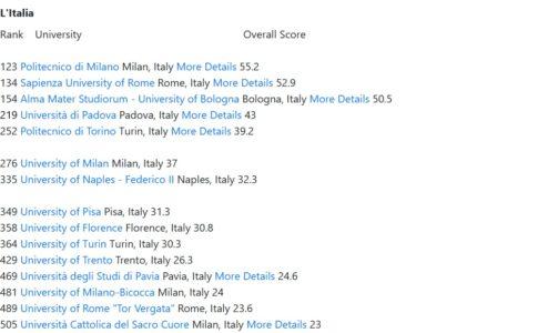 Quest’anno sono presenti 85 nuovi entranti – più della metà provengono dall’Asia, con Bangladesh (11 nuovi istituti), Indonesia (10), India e Malesia (cinque ciascuno) e Kazakistan (quattro). Due dei nuovi entranti sono nella classifica Top 10: National University of Singapore e University of California, Berkley.