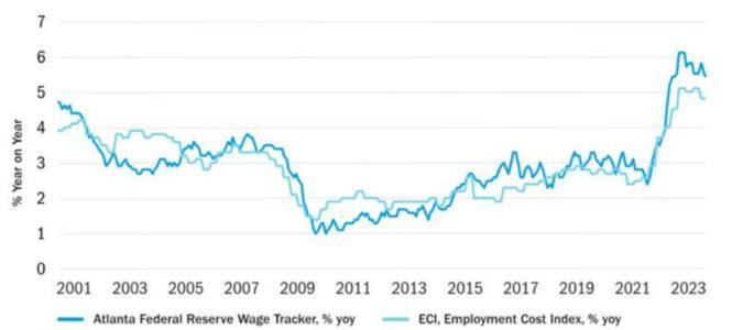 Fonte: Bloomberg al 26 giugno 2023 e Columbia Threadneedle Investments al 27 giugno 2023. Nota: Fed Wage Tracker basato sulla serie della Federal Reserve di Atlanta meno lo 0,6% per riflettere la distorsione rispetto all’ECI.