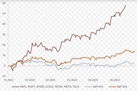 La previsione di solidi ricavi del produttore di chip Nvidia ha innescato un rally che ha fatto salire i titoli della tecnologia di oltre il 5% in dollari USA. L’indice tecnologico Nasdaq Composite è cresciuto di oltre il 30% nella prima metà del 2023: la performance migliore degli ultimi quarant’anni.